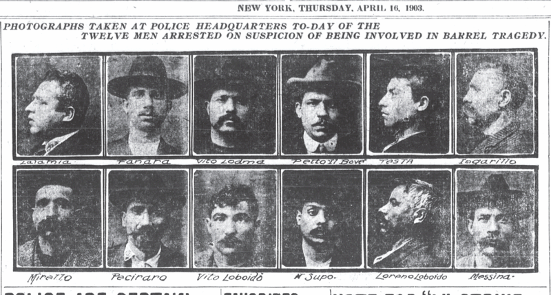 Three days later, The New York World reported twelve men being arrested, splashing their photos across the front page, and adding Testa, Lalamia, and Vito Lodma to the list. David Critchley reports their full names in The Origin of Organized Crime in America. The Christmas victim who the author of “‘Getting’ Them One By One” calls Nicola Nera might be Nicola Testa. “One by One” mentions Vito Loboido, but not his relative, Lorenzo.