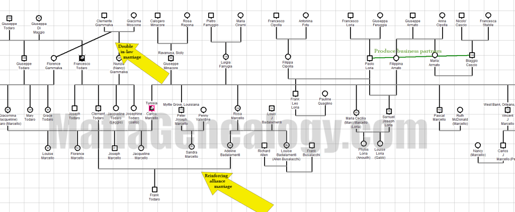The Marcello family tree may show us how a more traditional Sicilian Mafia family is structured. Carlos’ many brothers’ close business ties to his criminal empire, double in-law marriages in the Todaro family — Marcello was sponsored by Frank Todaro into the local Mafia Family — and reinforcing marriages between the Marcello and Todaro families, who were in power before Carlos arrived, are all classic indicators of Mafia families. Which branches engage in these practices can tell me where in a large extended family the tradition came from and who’s carrying it into the future.