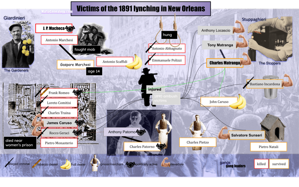 Tony Matranga and Anthony Locascio were ambushed with Geraci and the other stevedores, but were not among the victims of the lynching. Tony’s knee was shattered in the ambush and he later lost his leg. His brother, Charles Matranga (1857-1943), the leader of the Stuppaghieri, was one of the survivors of the lynch mob.