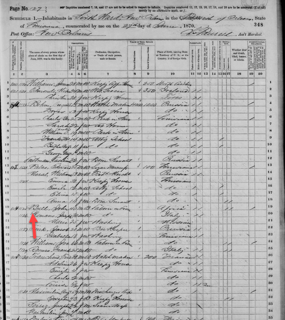 Frank Romeo (1843-1891) was one of the six caught by the mob near the women’s jail entrance. He was born Francesco Romeo in Molo in 1843. Of all the targets of the lynch mob, he had lived in New Orleans the longest: he arrived in 1859, before the Civil War, and was naturalized in 1868.