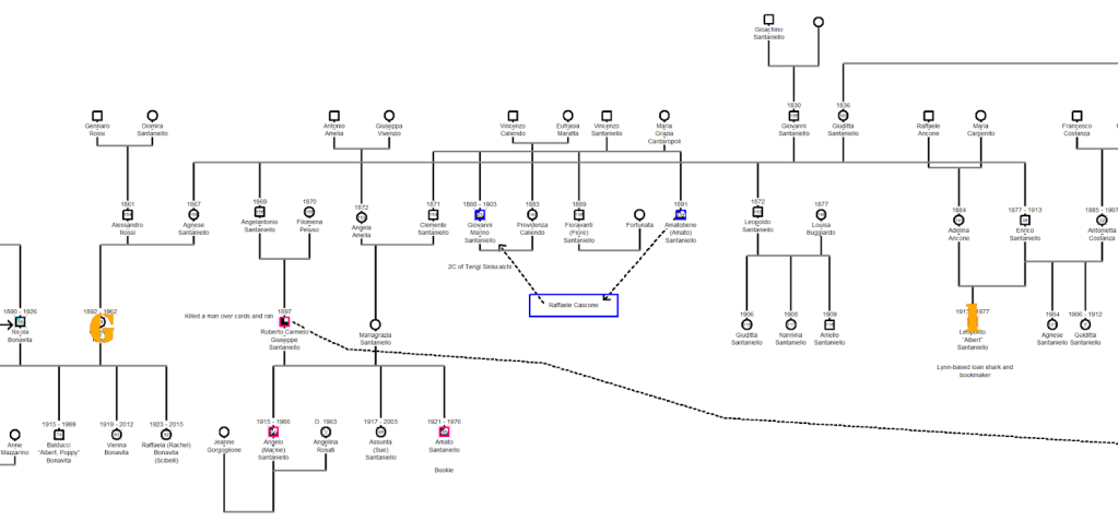 Roberto Santaniello, seen in the image above with a pink border and a line trailing away from it offscreen to the right (pointing to his victim, Bernardo Santaniello, in an unconnected family tree), is a paternal first cousin of Leo Santaniello, the bookie. Roberto is related through his wife—another Santaniello—to her uncles, Giovanni Marino, aka Giovanmarino, and Amatobene, whose icons have a blue background and arrows pointing to and from a box labeled Raffaele Cascone. Giovanmarino Santaniello, the elder uncle, was killed by Cascone in New York City in 1903 and his younger brother avenged him six years later.