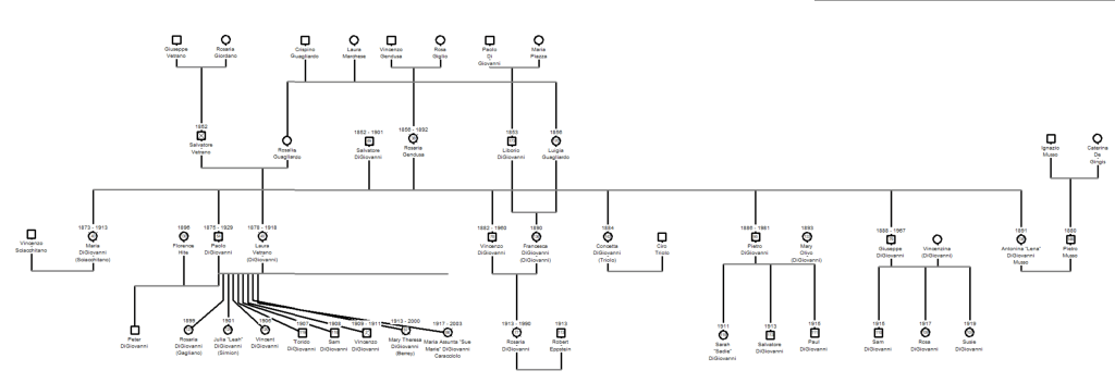 The DiGiovanni brothersโ eldest sister, Maria DiGiovanni Sciacchitano (1873-1913), was the brothersโ destination contact in New Orleans. The oldest brother was Paolo (1875-1929), followed by Vincenzo (1882-1960), sister Concetta (b. 1884), Peter (1886-1967), Giuseppe/Joe (1888-1967), and the youngest, Antonina, called Lena, born in 1891.