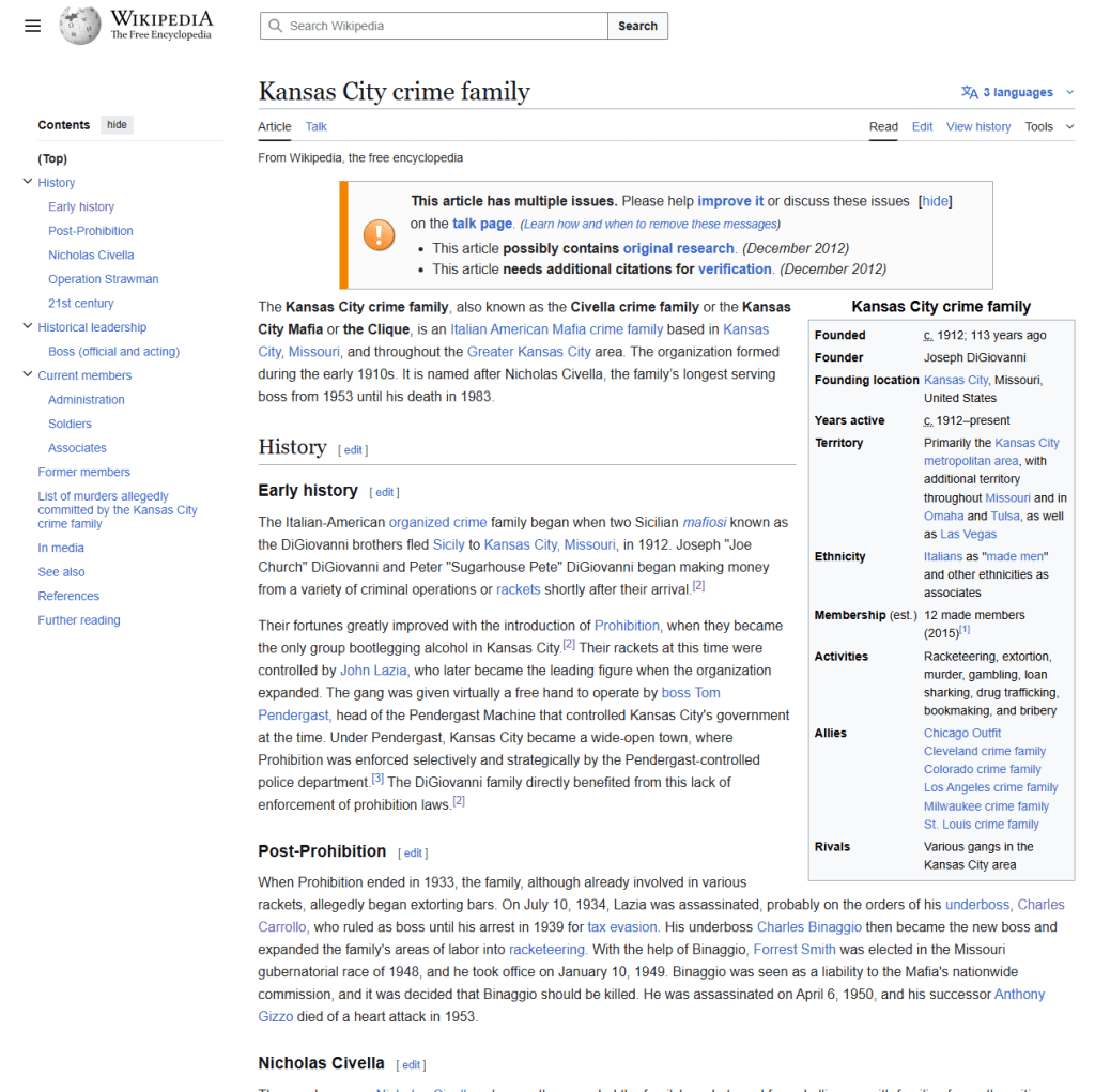 Screen shot of the Wikipedia article on the Kansas City crime family grabbed on 3 January 2026
