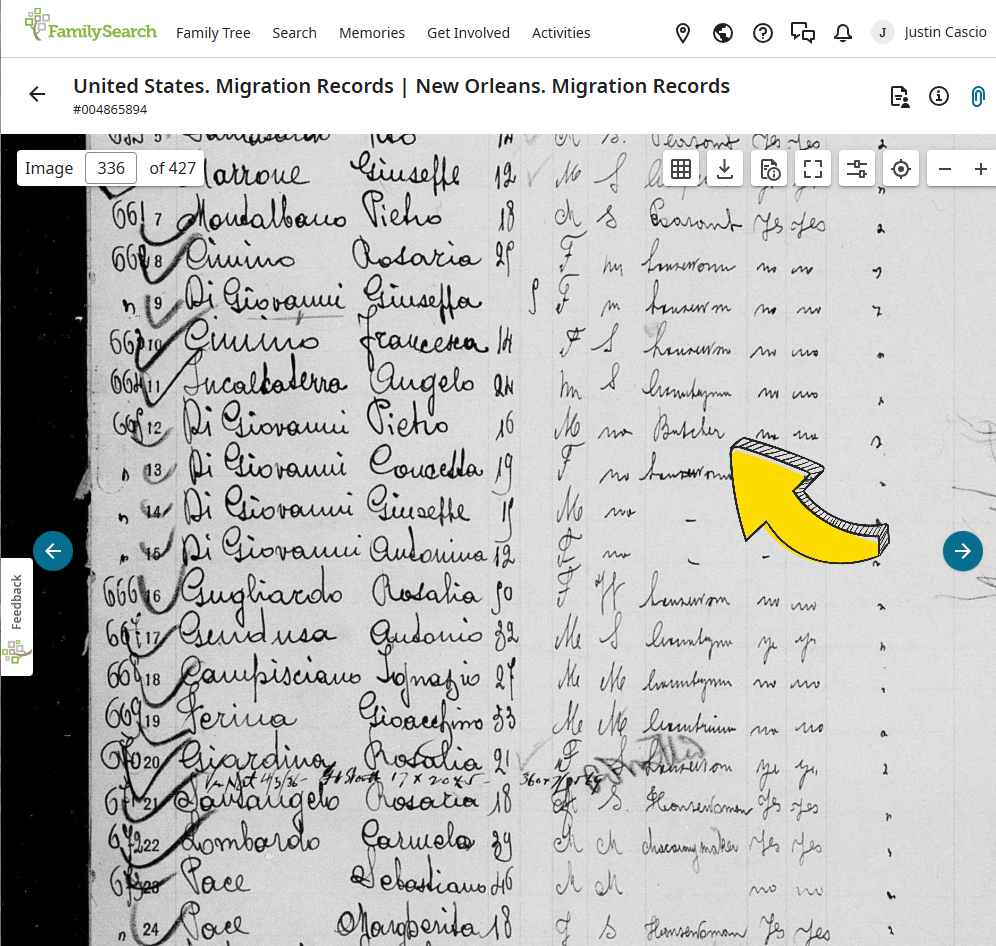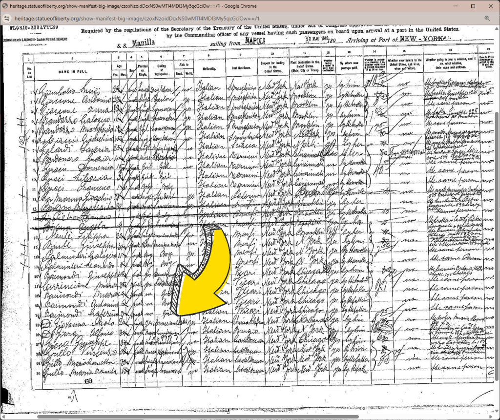 [1] Vzo. Di Giovanni on the Victoria. (1897, October 30). Line 21. https://heritage.statueofliberty.org/passenger-details/czoxMjoiNjAyNzQ1MDYwMDgwIjs=/czo4OiJtYW5pZmVzdCI7; Manifest of the Manila. (1900, May 31). Line 25. https://heritage.statueofliberty.org/passenger-details/czoxMjoiNjA1MTY0MDMwMDU1Ijs=/czo4OiJtYW5pZmVzdCI7; “New Orleans, Orleans, Louisiana, United States records,” images, FamilySearch (https://www.familysearch.org/ark:/61903/3:1:33S7-95C6-SQP?view=explore : Dec 3, 2025), image 336 of 427; United States. National Archives and Records Administration. Image Group Number: 004865894